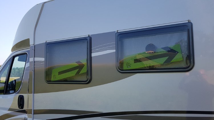 Vandaag is de dag in de Tour van de veelbesproken rit van 65km met Formule 1 start, en die willen we wel zien. Dus daarvoor gaan we stoppen. En dat doen we op de parking van een dancing, haha. Och ja. We zwieren alle mogelijke ramen en luikjes open want het is heet, en we installeren ons om tv te kijken. Tot we weggejaagd worden: dit is een privé parking en hier mag niemand staan. Euhm ja, fuckers, we staan toch niet in de weg, op de parking is niemand, de dancing is (op een woensdagnamiddag om 14u45) gesloten. Maar goed. Geen discussie, we ruimen op en vertrekken. En zoeken een ander plaatsje. Zwieren alle ramen en luiken terug open, zetten de tv aan en zijn net op tijd om de start mee te maken. Die eigenlijk een maat voor niets is, maar goed. Whatever.