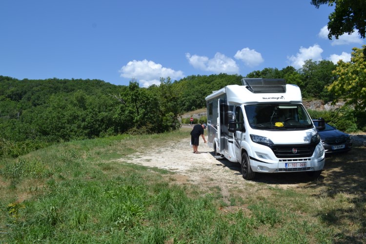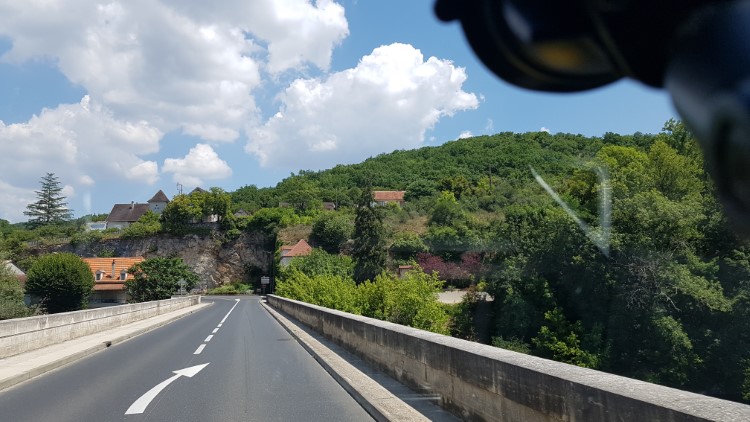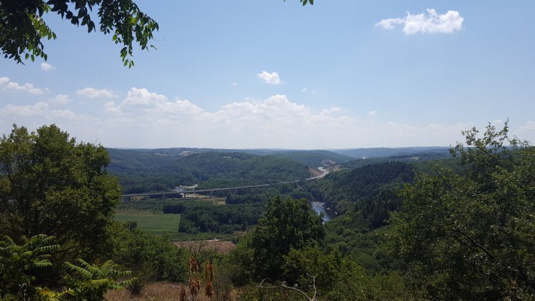 Rond 13u willen we stoppen om te eten. En dan zijn de parkings natuurlijk niet te vinden. We zijn ondertussen op grote wegen beland (doet wel eens deugd, na al die kleine kronkeldingen, een brede nationale te hebben), en daar zijn enkel kleine parkings vlakbij de weg. Urgh. Eindelijk komen we een parking tegen, waar veel mensen staan, maar ook met een mooi zicht op de Dordogne-vallei. We eten een koude schotel en genieten van het landschap.