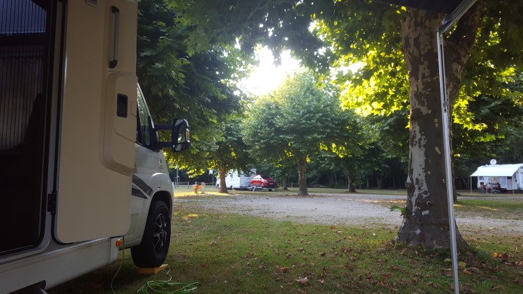 We rijden nu echt naar Forgès en vinden de camperplaats redelijk probleemloos. Opnieuw is het een oude camping, het is er niet al te groot, met veel gras, veel bomen en lommer, en weinig mede-campers. Rustig, zalig, zo hebben we het graag. We gaan onder de bomen staan, schaduw is nu belangrijker dan satelliet, want ik zou toch liever wat vroeger gaan slapen vandaag dan naar Vive le Vélo te kijken. Dat kunnen we thuis nog doen.