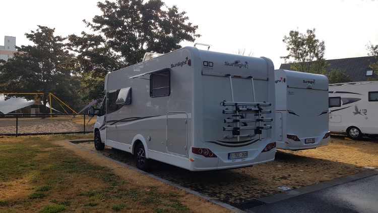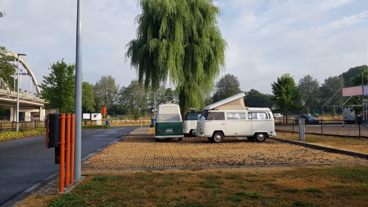 we laden in de loden hitte onze spullen in bakken en zetten alles binnen. Opruimen is voor later. We rijden naar mijn ma en Herman om hun kampeerspullen terug te geven, naar de aankomst van de rit van vandaag te kijken en een beetje te babbelen. Daarna vertrekken we naar de camperplaats van Sint-Eloois-Vijve, waar we de laatste nacht van onze reis doorbrengen. Het is er lawaaierig wegens een zomer pop up bar, maar we zien wel, we zullen wel kunnen slapen waarschijnlijk. Het poetsen is voor morgenvroeg: de binnenkant van de camper doen we gewoon zelf, de buitenkant in een truck carwash.