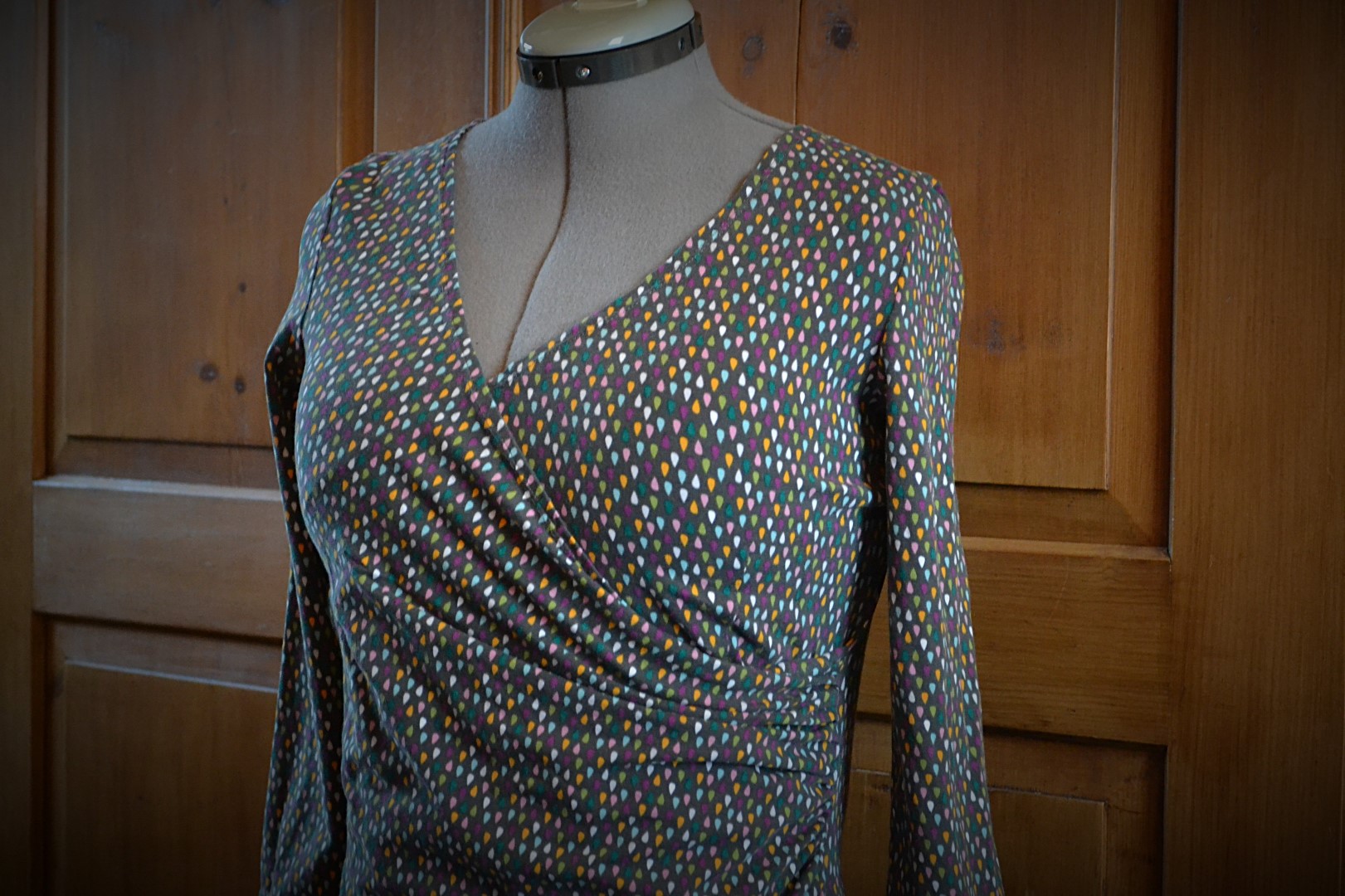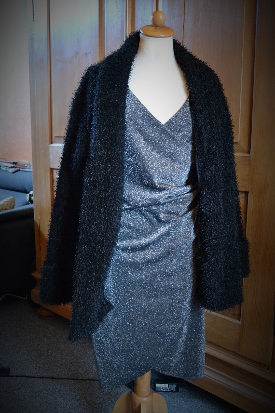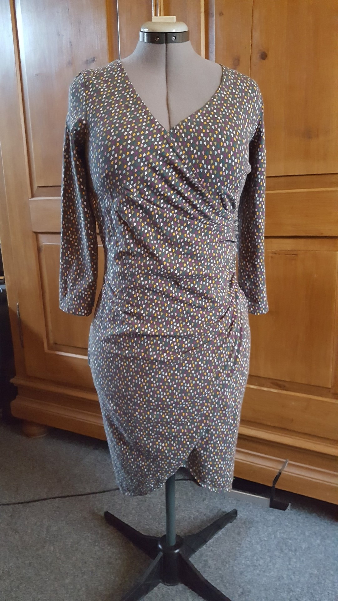 Het resultaat mocht er wezen, maar was jammer genoeg een béétje nipt: de stof rekt niet zoals ik gedacht had. Niets wat toen met wat corrigerend ondergoed niet te redden was, maar nu ben ik (nog) wat bijgekomen en durf ik mezelf er niet meer inwurmen. Vanaf februari probeer ik weer af te vallen, in december en januari laat ik ambitieuze plannen op dat vlak maar in de kast. Ik drapeerde het jurkje voor de foto over mijn paspop in kleinere maat omdat de grotere bekleed is met stroeve stof, maar je krijgt wel een idee.