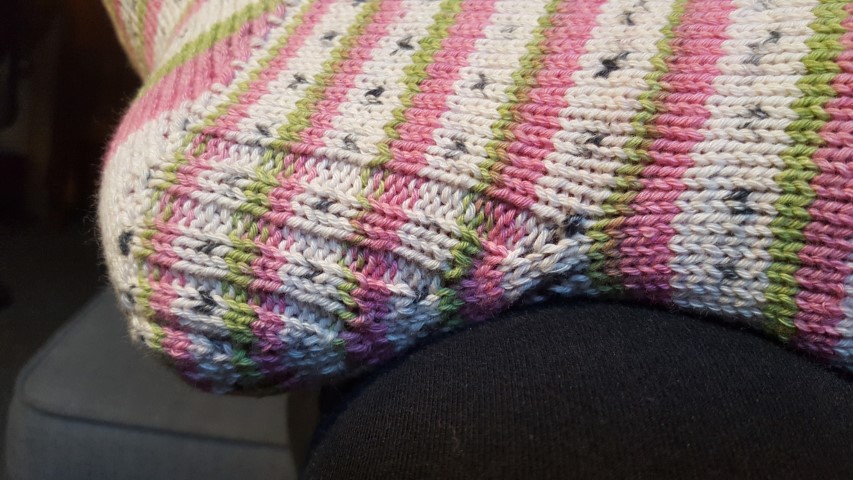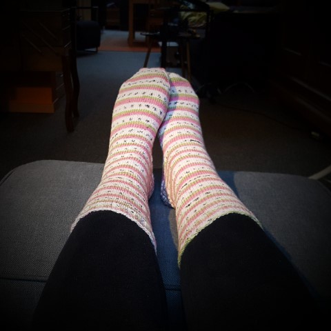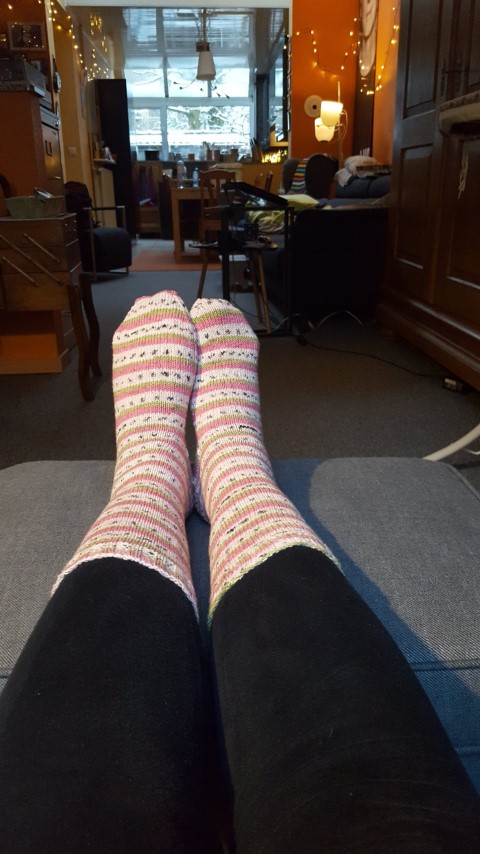 Ik bloos nu een beetje… Heb je de streep ook na het wassen (blocken) nog? Ik doe ze ook altijd gewoon aan voor ik ze block. Ik heb me erover gezet dat de boord wat meer lubbert dan bij gekochte kousen, zolang ze niet lubberen als je ze aan hebt. En de gaatjes kan je voorkomen door je steek te draaien/twisten. Ik vind ze alvast meer dan geslaagd. Mijn eerste paar was ook een beetje te groot aan de voet, het is wat wennen om hier met wat negatieve ease te werken vind ik.