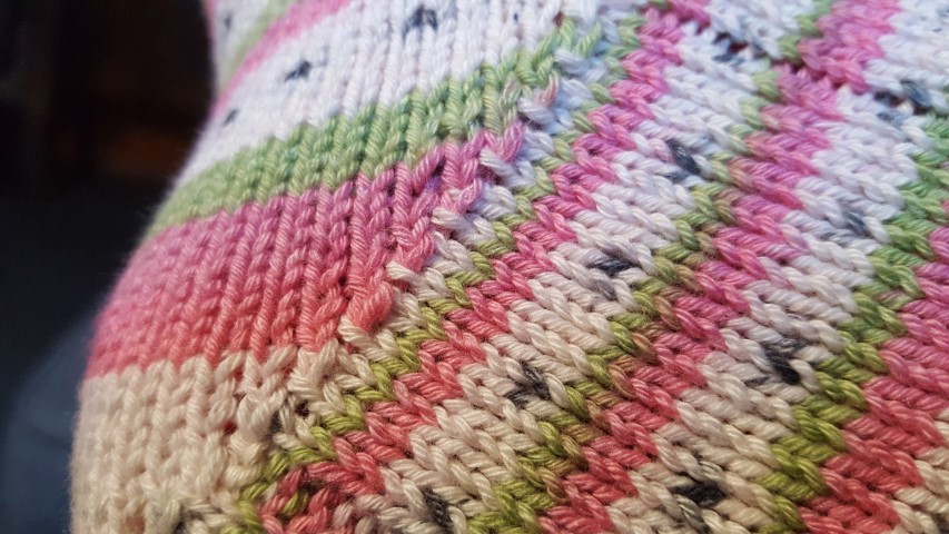 - de streep langs beide kanten. Gevolg van breien met de rondbreinaald. En dan begin ik toch weer te overwegen of ik eens met 4 (5) naalden zou proberen. Aaaargh!