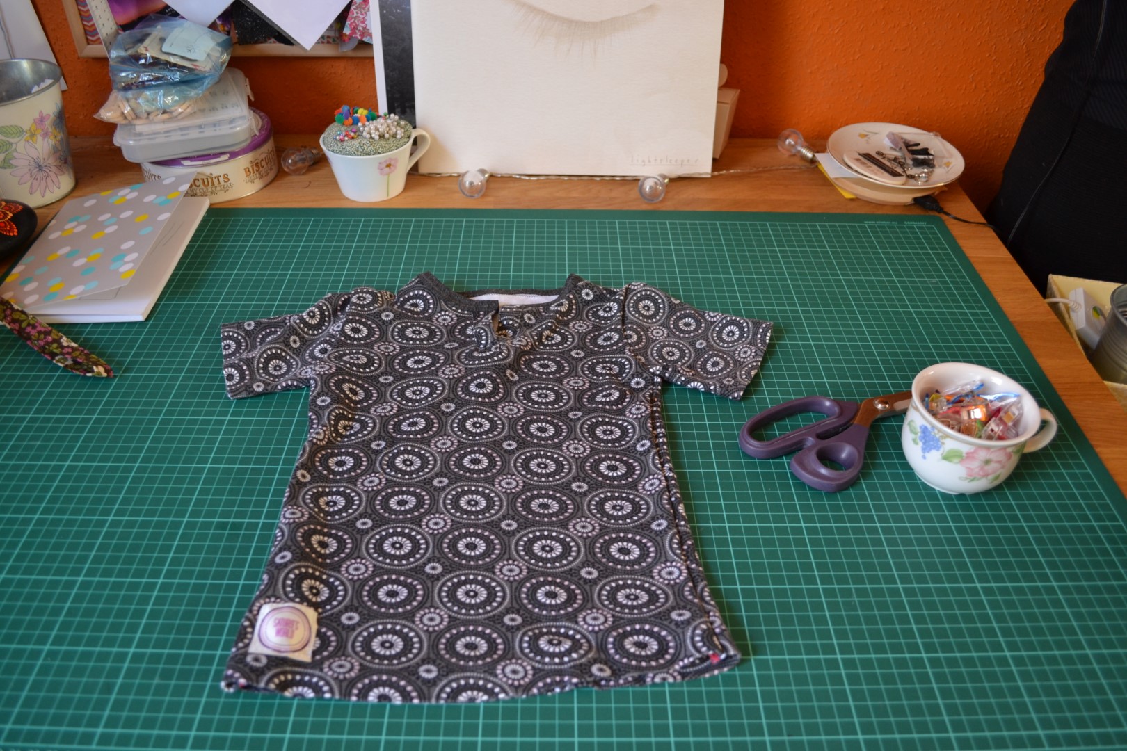 Halslijn afgewerkt met tricot biais van de Veritas, etiketje erop, en klaar!