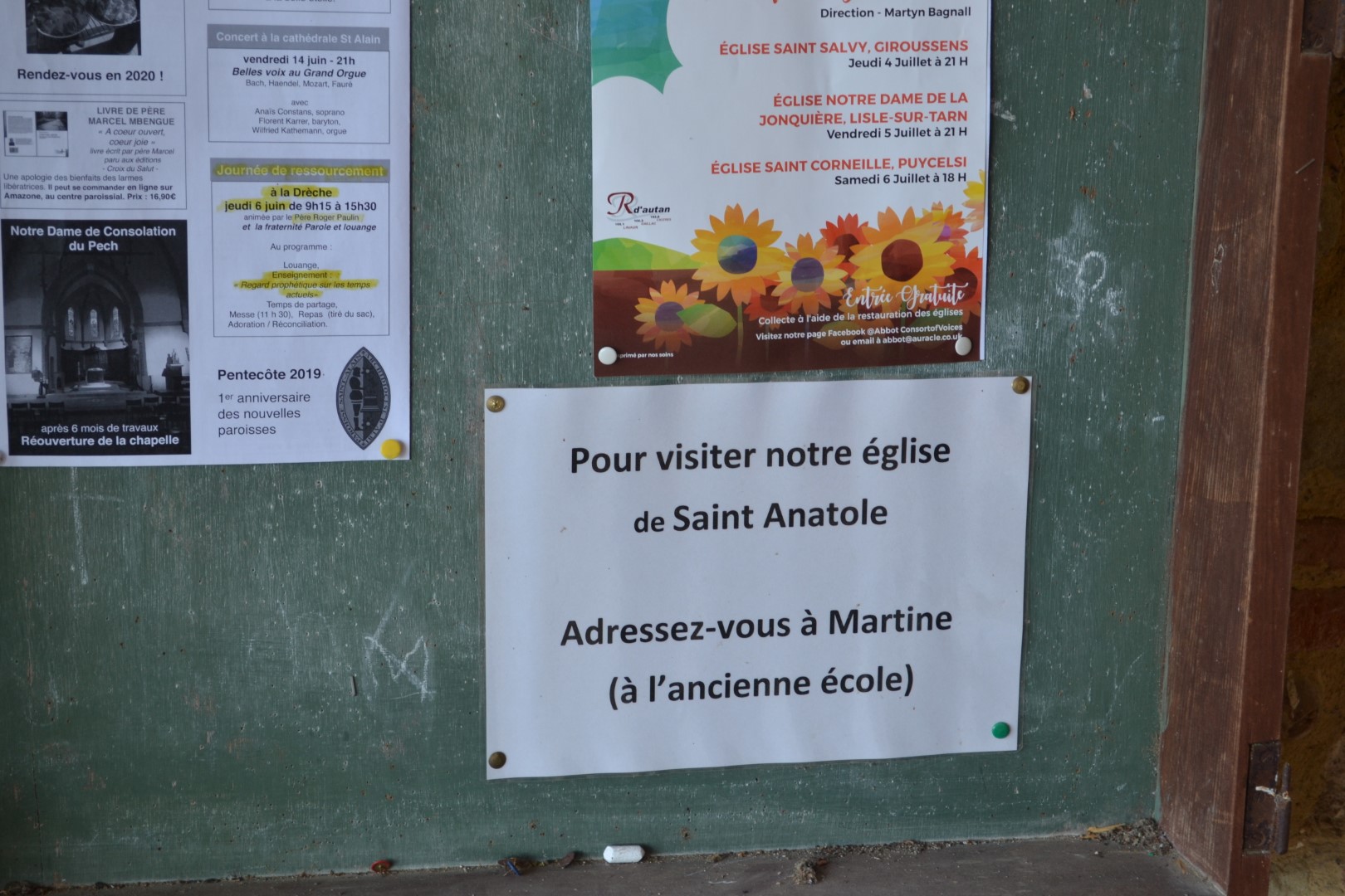 De pastoor en zijn vrouw zijn een spandoek aan het ophangen (niet voor de Tour, maar voor een bezinningsdag binnenkort), en kibbelen een beetje. We slaan een praatje met de vrouw, die verrassend veel van de koers kent (ze kent zelfs Gent-Wevelgem!), en geïnteresseerd is in wat we doen. Ze vraagt of we een rondleiding willen in de kerk, we stemmen toe (en denken heimelijk, god in de hemel, waar zijn we aan begonnen), maar haar uitleg is kort en interessant, en ze houdt ons maar een kwartiertje bezig. In Vlaanderen had ik dit klef gevonden, en sterk ruikend naar de KVLV (al op voorhand mijn excuses als ik hiermee iemand beledig), maar deze mevrouw is verfrissend in haar enthousiasme en de kneuterigheid is aandoenlijk.