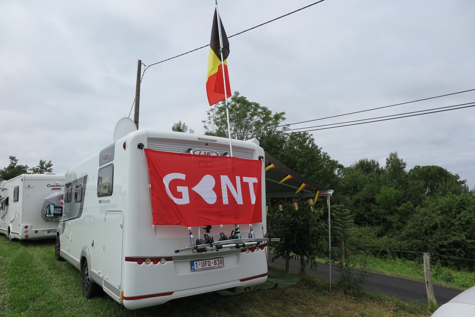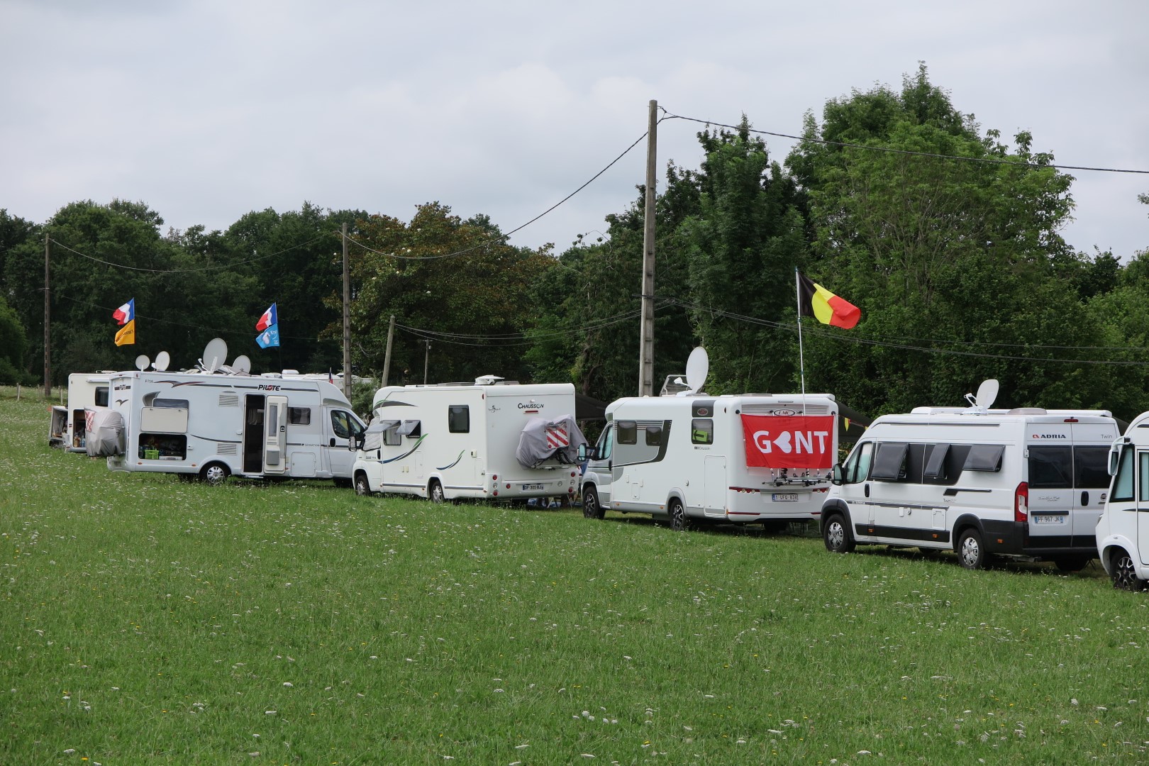 Om 9u zijn we al aan een Lidl in de buurt van Pau. We doen op het gemak boodschappen, zodat we de komende dagen voorzien zijn van proviand. In de Lidl hebben ze toch wel wat minder keus dan in de Super U, en uiteindelijk gaan we nog snel naar een Super U anderhalve kilometer verder, om ons te voorzien van bidons water. Daarna trekken we naar het parcours. Ik, slimme, had gedacht dat we dat bergje bij Uzos zouden vermijden, maar ik had het lichtjes mis op, we rijden de berg op langs een kant waar het veel steiler is. Oeps. Hebben we toch even dat Pyreneeën-gevoel, ha! We belanden op het parcours, en zien maar weinig (of geen) gelegenheid om te staan. De weinige plaatsjes die er zijn, zijn al ingenomen. Tot iemand ons teken doet dat op een wei wat hogerop plaats is. En op die wei mogen we staan, er staan zelfs pijltjes waar je er moet oprijden. We gaan dus op de wei staan, bij de andere campers die er al staan. En we zijn content, want het is een goed plaatsje, in de gemeente Rontignon. Mooi uitzicht, goed zicht op de weg. Ergens verwachten we wel dat de boer nog wel eens langs zal komen om standgeld te vragen, maar daar zitten we niet mee. We vinden dat de mens in dat geval geen ongelijk zou hebben, en we zijn blij dat we hier kunnen staan.