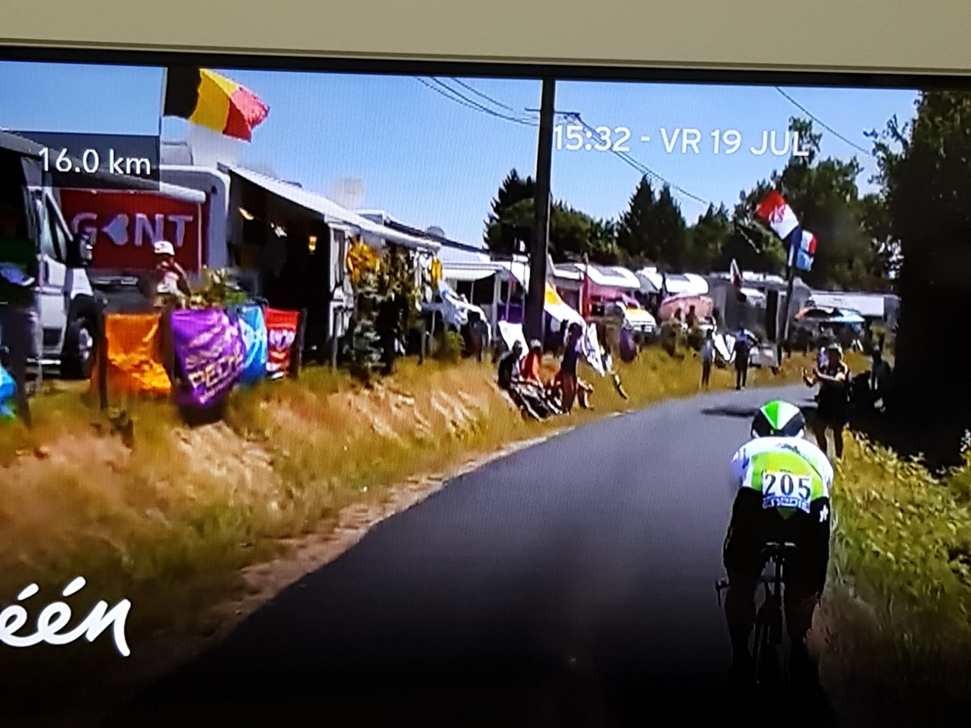 Nog voor 10u passeert opeens het damespeloton. Ik had niet gevonden om hoe laat ze startten, maar blijkbaar was dat dus nog vóór de publiciteitskaravaan. Vind ik wel wat minnetjes. Na het damespeloton passeert een groot deel van de publiciteitskaravaan, dan passeert het damespeloton een tweede keer, gevolgd door de rest van de publiciteitskaravaan. Dan zijn we daar eindelijk toch vanaf. De dames passeren nog 3 keer, we zien waar we staan op TV, dat gebeurt niet vaak. (ik denk dat ik erin geslaagd ben om een foto te kiezen waarop we achter groen verscholen zitten maar hey, whatever, we stonden daar en dat was toch wel wijs!)
