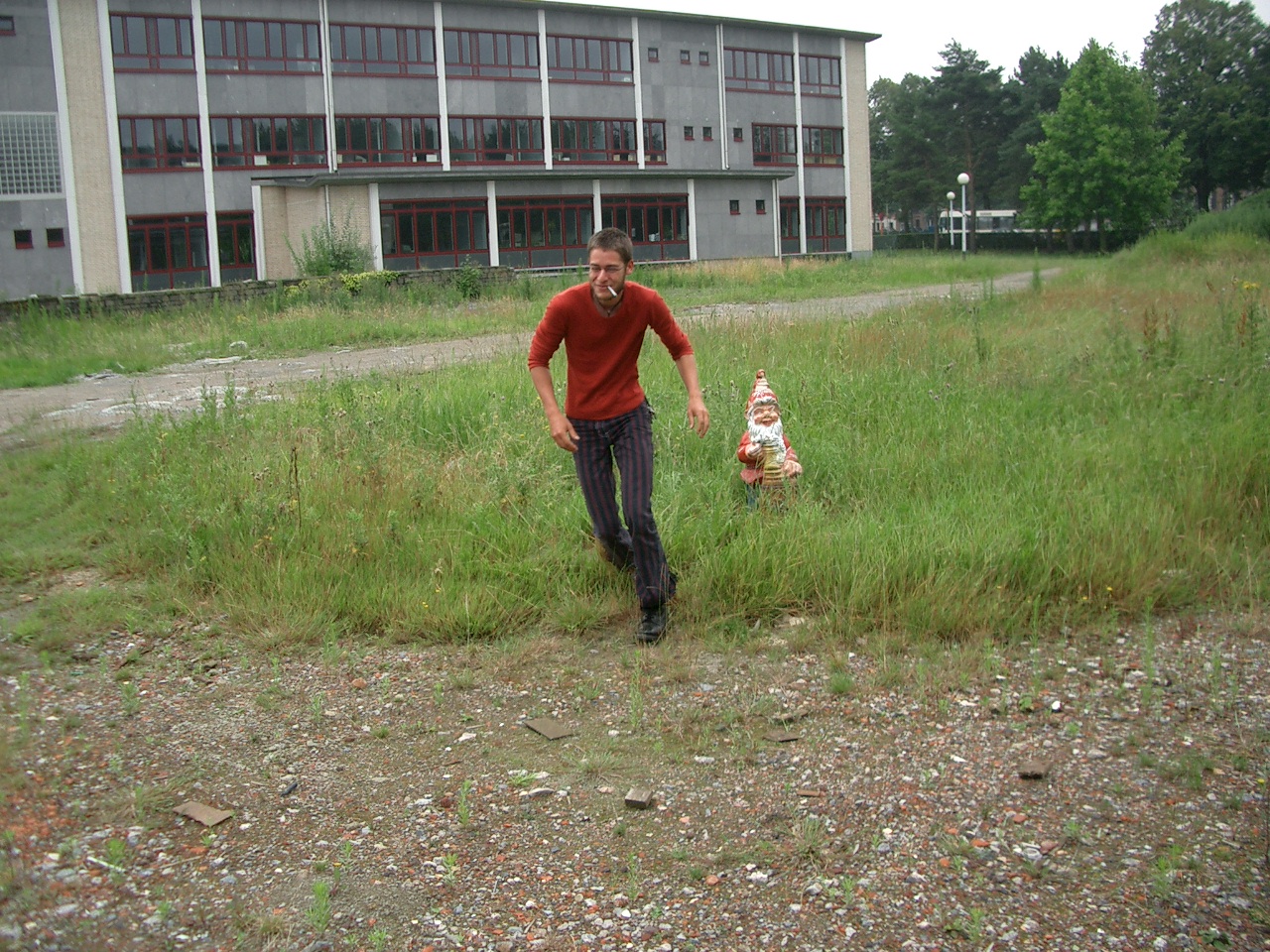 Als uitsmijter nog deze zalige van lang geleden (16 jaar geleden). Toen we met Farmaka nog in de Jubileumlaan zaten, in een gebouw van het OCMW. Ik werkte er nog niet lang. Op het gelijkvloers was een lokaal dienstencentrum, waar veel activiteiten waren voor senioren. En daar beneden stonden ook cheeky tuinkabouters op het terras. Mijn collega Stijn pikte er eens eentje om hem wat verder in het gras te zetten. Zalige foto vind ik dit nog altijd!