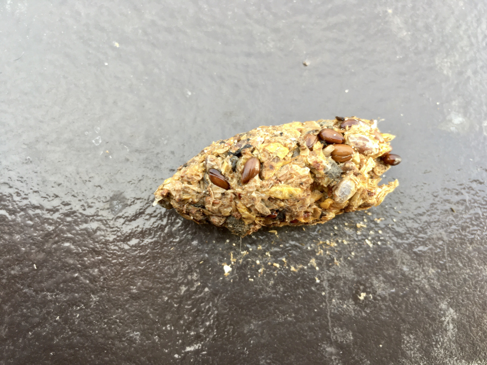Die bewuste ochtend startte ik met een stevig ontbijt boordevol fruit, yoghurt en granola om gewapend te zijn tegen een hongerklap tijdens de wandeling. Onderweg zag ik op de reling van een wandelbrug een stuk geklonterde granola liggen. Zo’n klonter honing waarin extra noten en zaden zitten geplakt, de klomp die ik altijd laat liggen tot op het laatst omdat hij zo heerlijk zoet en krokant is. De gids kon mij er op de valreep van weerhouden om het snoepje in mijn mond te duwen. Het bleek een braakbal van een meeuw te zijn. Ik had altijd gedacht dat enkel uilen ballen braakten, maar meeuwen dus ook. Te herkennen aan kleine stukjes schelp in de braakbal.