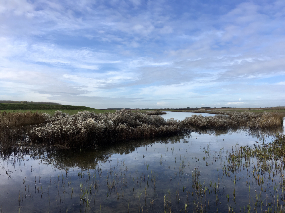De schorrenplanten beginnen welig te tieren. De opgedroogde pluizen van de zeeaster zullen zich weldra verspreiden. Nu bollen ze mooi op aan de randen van het water. Een schitterend uitzicht.