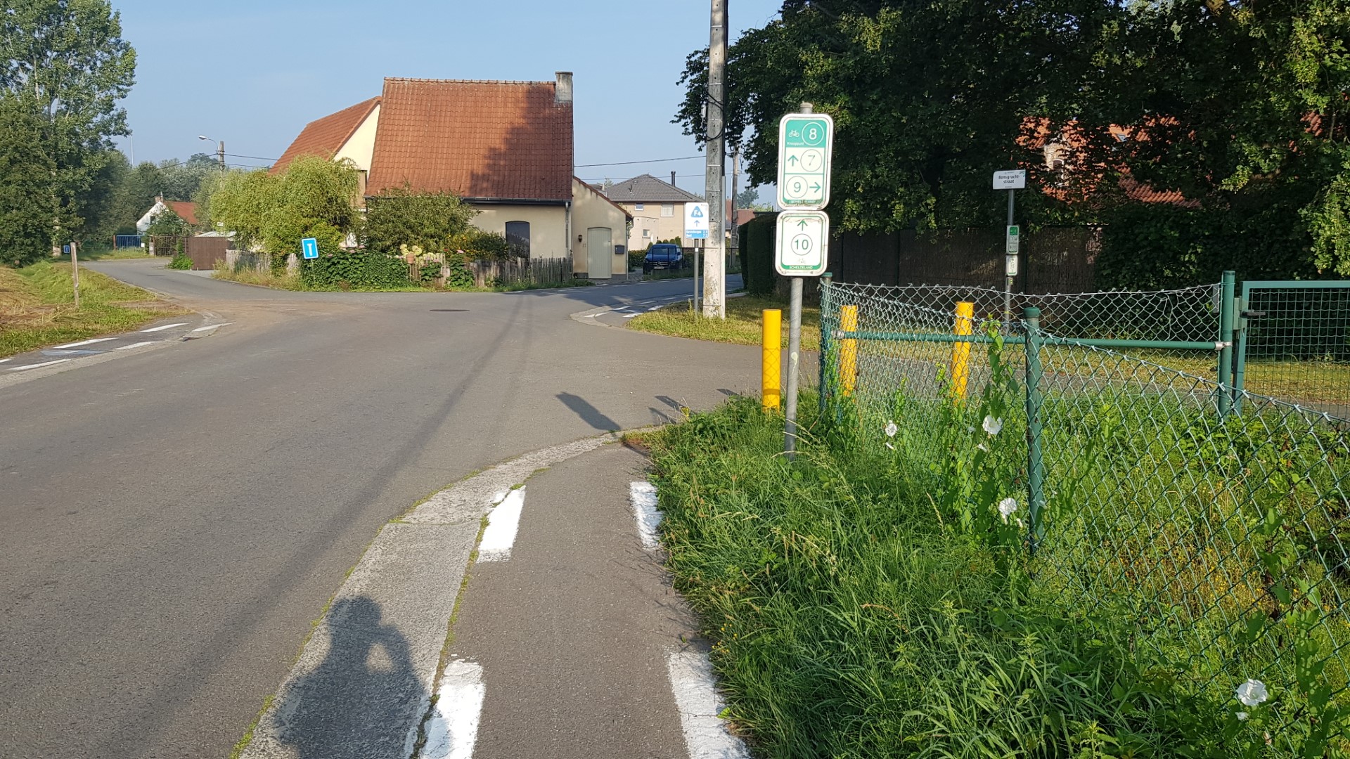Ook op deze fietssnelweg vind je moordstrookjes. Zoals dit hier, in de Houtstraat. En laat je niet vangen door de fietsknooppuntbordjes op de vorige foto. We zijn pakweg 200 meter verder nu, en hier bevinden zich 3 bedrijven in de voedingssector, onder andere een bedrijf in de vleesverwerking. Op weekdagen rijden hier vrachtwagens en bestelwagens af en aan, en het is hier ook druk omdat er een oprit naar de R4 vlakbij is.Â